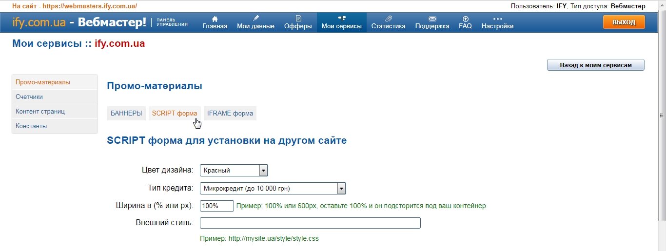 После того как вошли в настройки сервиса, кликаем раздел слева "Промо-материалы", потом "SCRIPT форма".