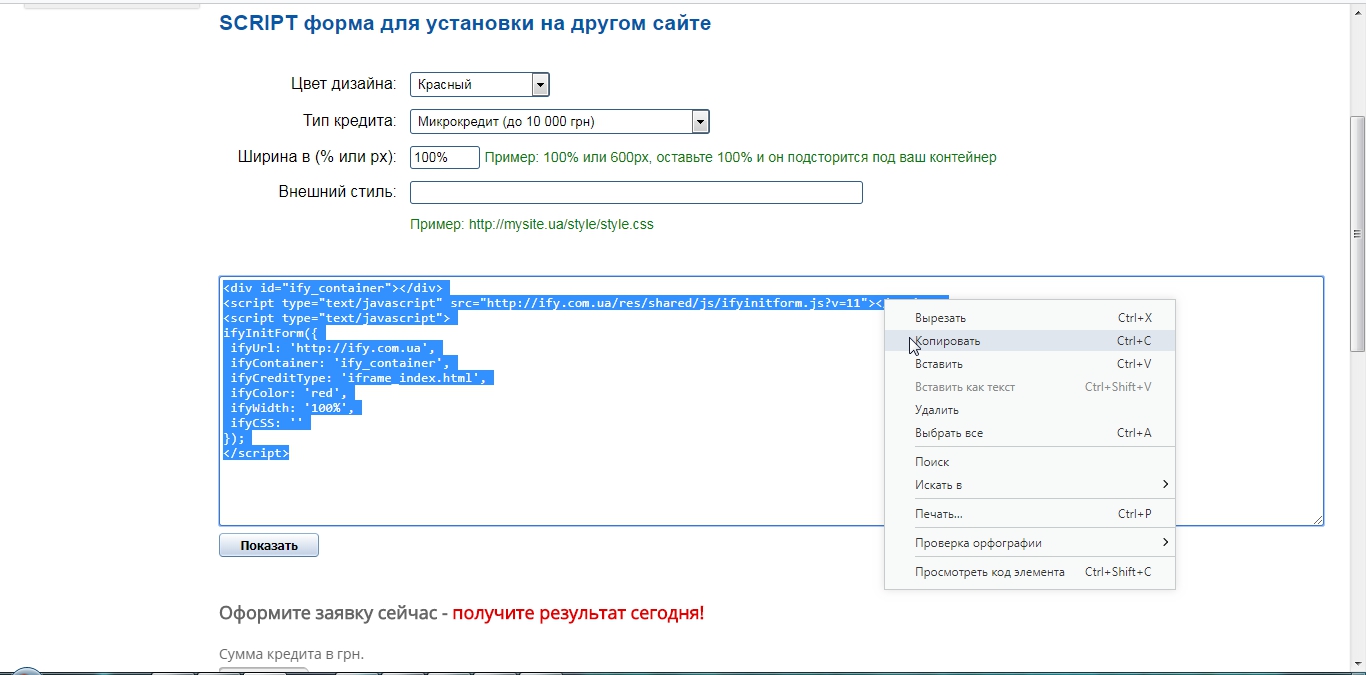 Теперь нужно выделить HTML код SCRIPT формы, правым кликом выбрать "Копировать" и вставить в нужное место на вашем сайте.