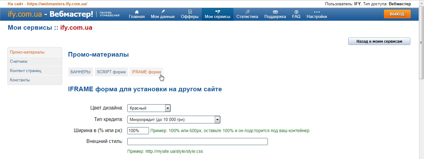 После того как вошли в настройки сервиса, кликаем раздел слева "Промо-материалы", потом "IFRAME форма".