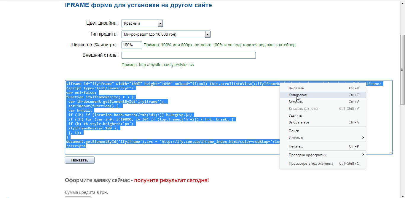 Теперь нужно выделить HTML код IFRAME формы, правым кликом выбрать "Копировать" и вставить в нужное место на вашем сайте.